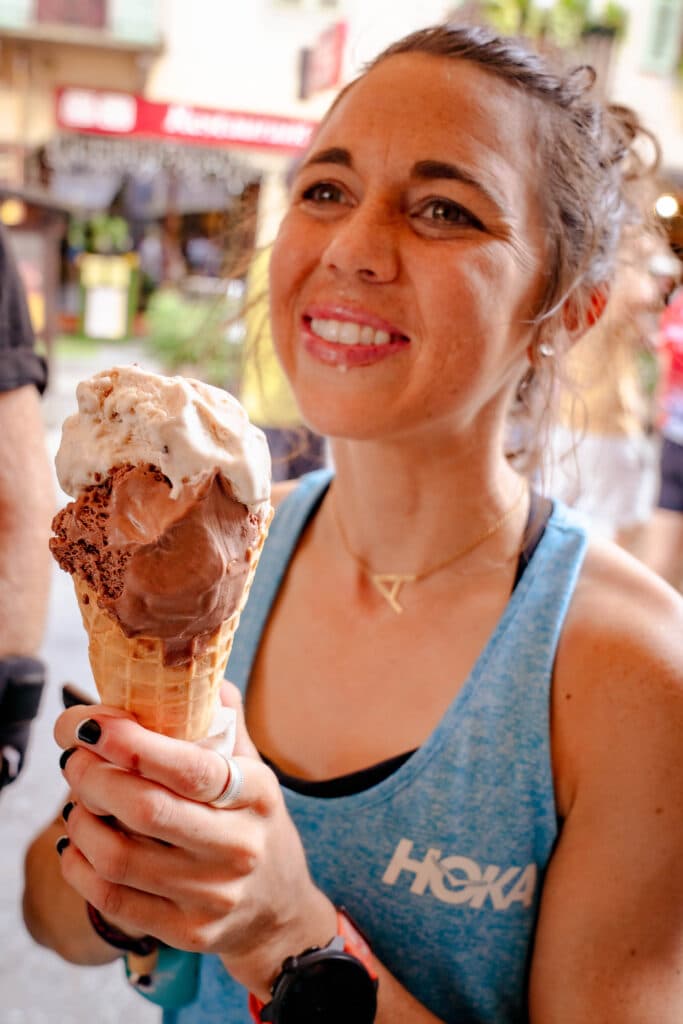 Gelato, Ice Cream, however you say it, it’s a popular post-run or after-meal treat in Chamonix. Wandering the pedestrian streets, like Rue du Dr Paccard, you’ll find an abundance of shops displaying their colorful and consumable artwork. Often there will be lines of tourists – which this week often include some of the best trail runners in the world, like Allie Mac— eager to get a cône or pot. The array of options and elaborate flavor combinations are always too much for my indecisive brain, so I make the safe choice– and opt for multiple scoops!