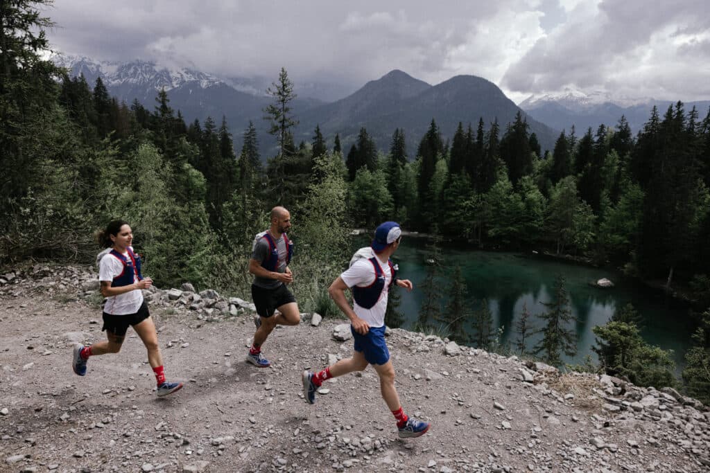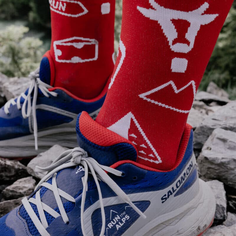 For two years, we developed a custom Run the Alps-designed set of trail running gear with Salomon. Specifically, our own Glide Max shoe, socks, and a colorful Run the Alps – themed trail running vest.