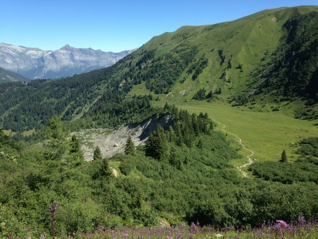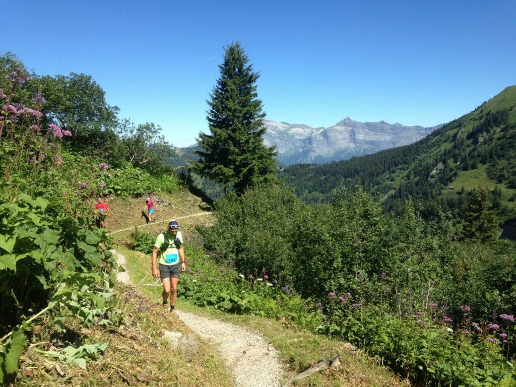 As for the route, after a few hundred meters of flat in the park, the route quickly climbs through a pretty pine forest on a very narrow and steep trail. The first 15 km is a mixture of climbs and flatter portions on tarmac, dirt paths or trails, and crossing villages and even smaller hamlets such as St Gervais, Le Champel and Bionnassay. This very fast section climbs a vertical kilometer, leaving half of the ascent for the last 5 km. Nothing extreme if you are used to running or hiking on mountain trails, but what amazed me that day was the 70-year-old runner still cruising at that stage… While everyone around was barely at a fast walking pace, if not at a total stop because of cramps!