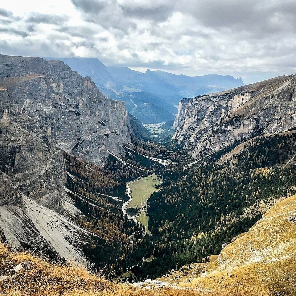 After the previous big day out, Mark and I opted for a shorter route with a run up and around the rim of the aptly named Vallunga, or “Long Valley”. We started and finished in Selva, a pretty village up from Ortisei and earmarked for an overnight stay on our upcoming Run the Alps tour. The sky was a little more gray and brooding than the day before, but no rain was forecast and the contrast would be interesting. The trough-shaped valley is about 6km long and features 500m high cliffs on both sides. There are only a few places where pathways breach these natural ramparts. We were able to exploit one of these to reach the scenic trail which circles the valley on the high ground above.