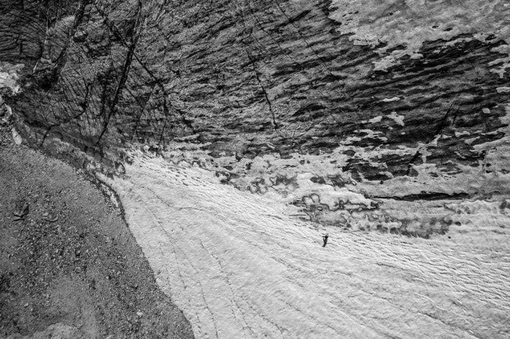 Hillary: There’s a big traverse across a challenging boulder field, a crossing of a glacial moraine, a glacial river, another moraine… then you come to the Rothorn hut. After that, you traverse below a glacier, off-trail and alternating between glacier-polished slabs and big blocks, with lots of technical scrambling and fixed ropes for safety.