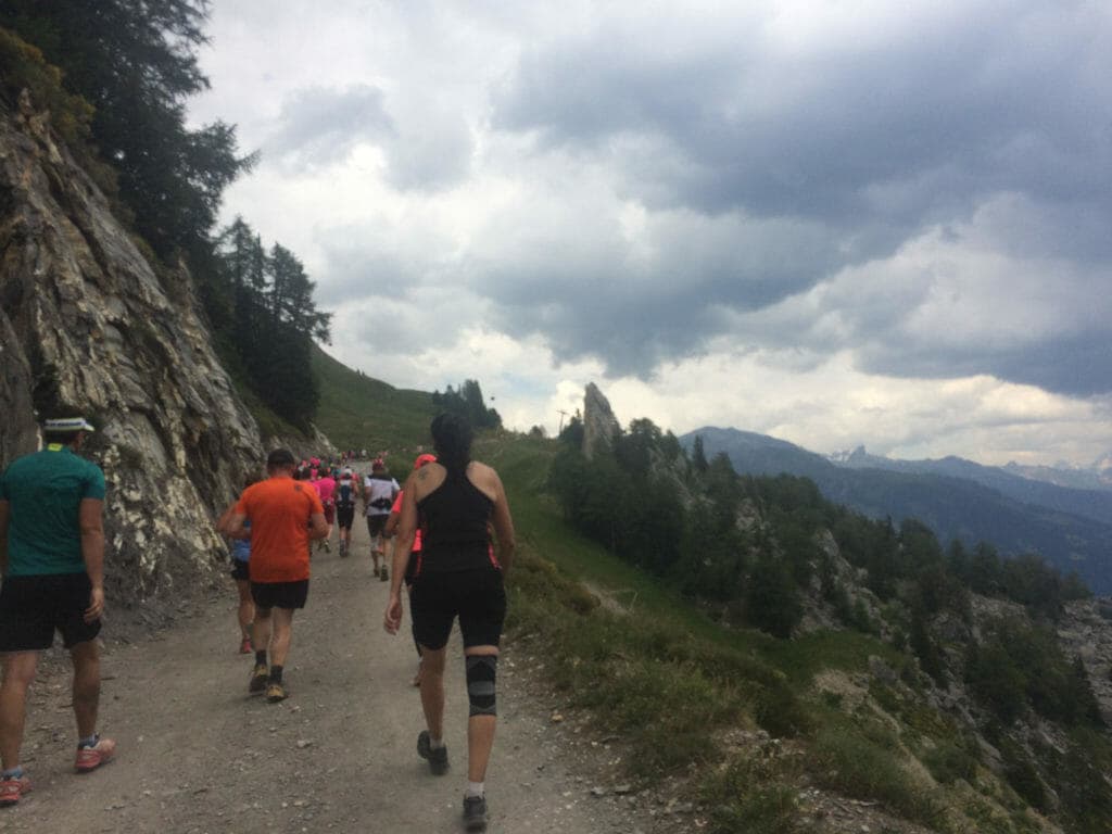 As I had not done any specific training for this event, I decided to start towards the back of the pack, to allow the stronger runners to fly ahead. I think I seeded myself incorrectly however, as people mainly walked the first 3-4km and the trail was filled! I was given some trail running tips a few weeks before the race from Run the Alps Senior Guide Emily Geldard. One was that on the steep sections, push off your knees with your hands for more forward propulsion – I got to see this in action from some other competitors and try it out, which really helped. The ascent was sharp, climbing 400m in 3km. With such a busy trail, it was hard to push ahead, so this first section was a fast walk uphill. This was still pretty tough, with no chatting to be heard in this segment – it was silent apart from the puffing and panting racers, spectators cheering from the sidelines, and the birds singing away in the vast forest.