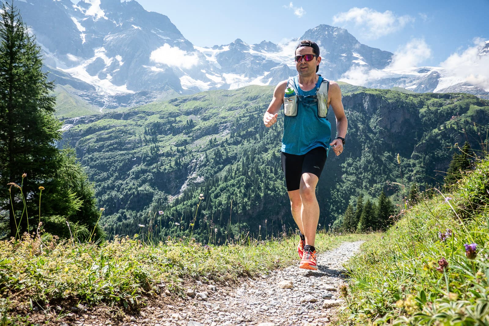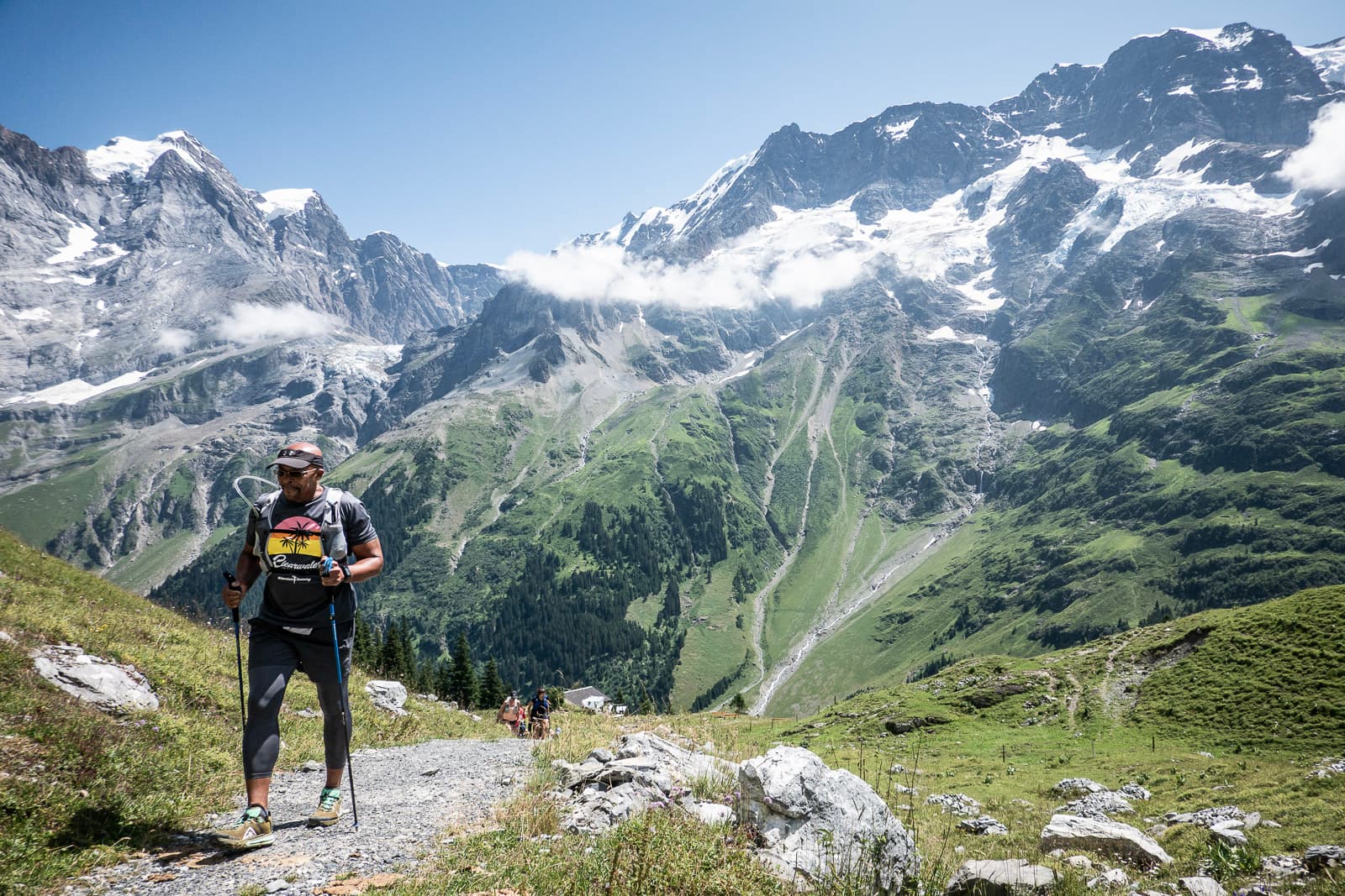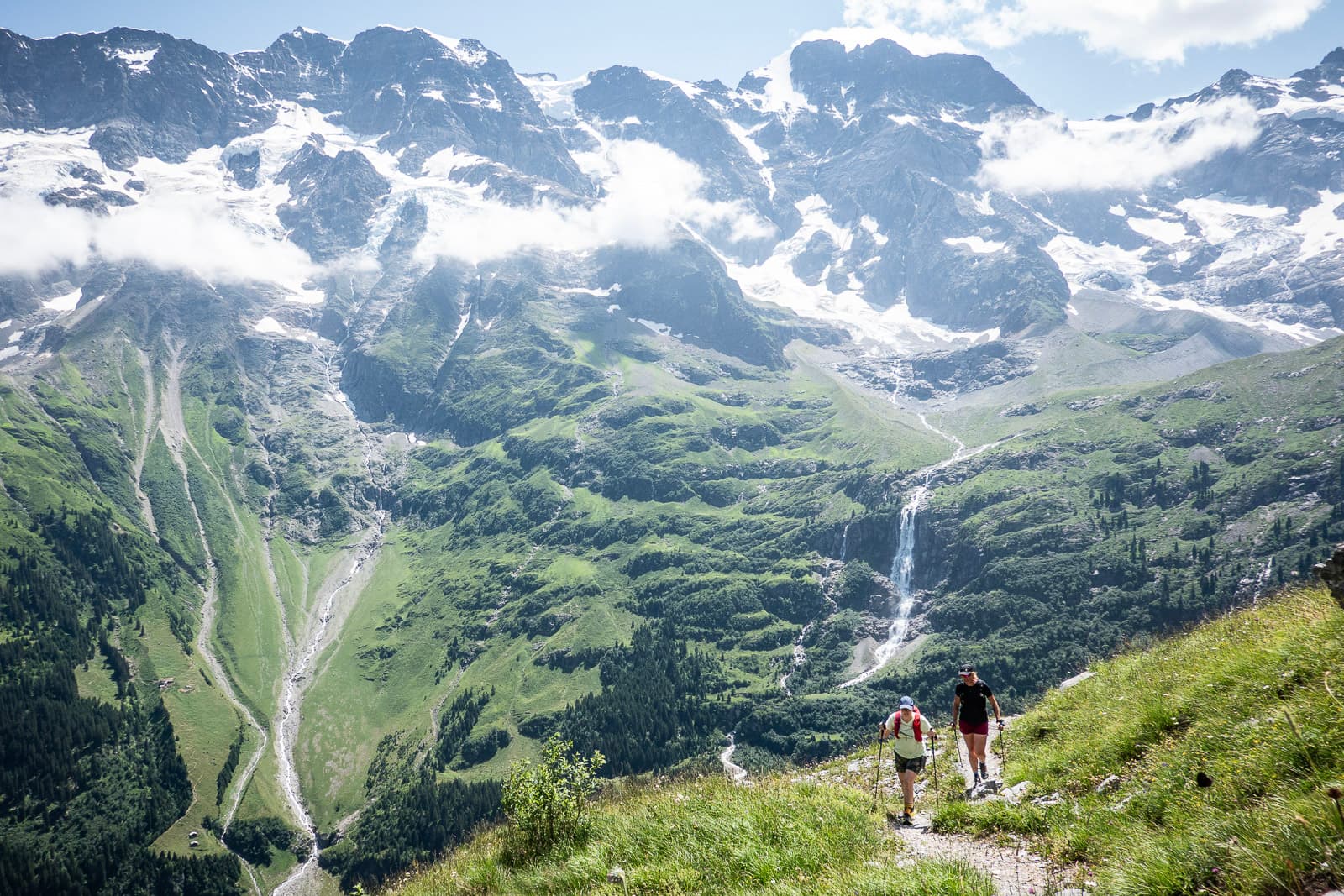 Our next day took us on a stunning route to our final hotel in Mürren. Using train and bus to get to the waterfall-abundant Lauterbrunnen valley, our run climbed to the historic Obersteinberg mountain hotel, and higher to traverse the dramatic balcony path beneath the Tanzbödeli, a grassy plateau known as the “dance floor.” Dropping through the breathtaking Sefinental hanging valley, we then tackled the final climb up to the small traditional village of Gimmelwald.