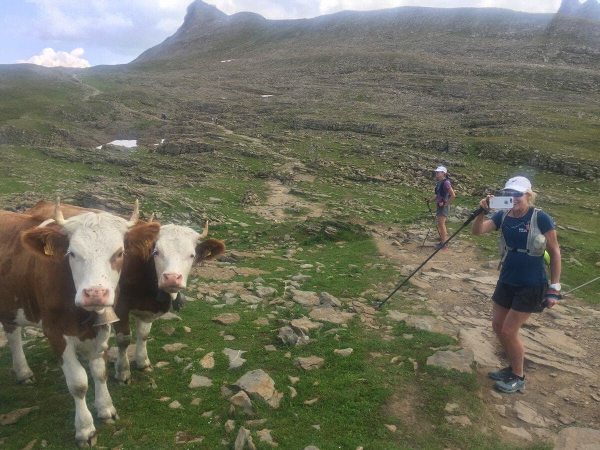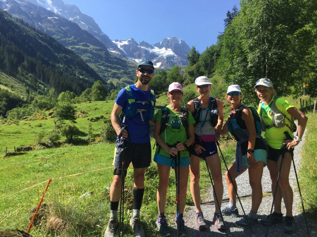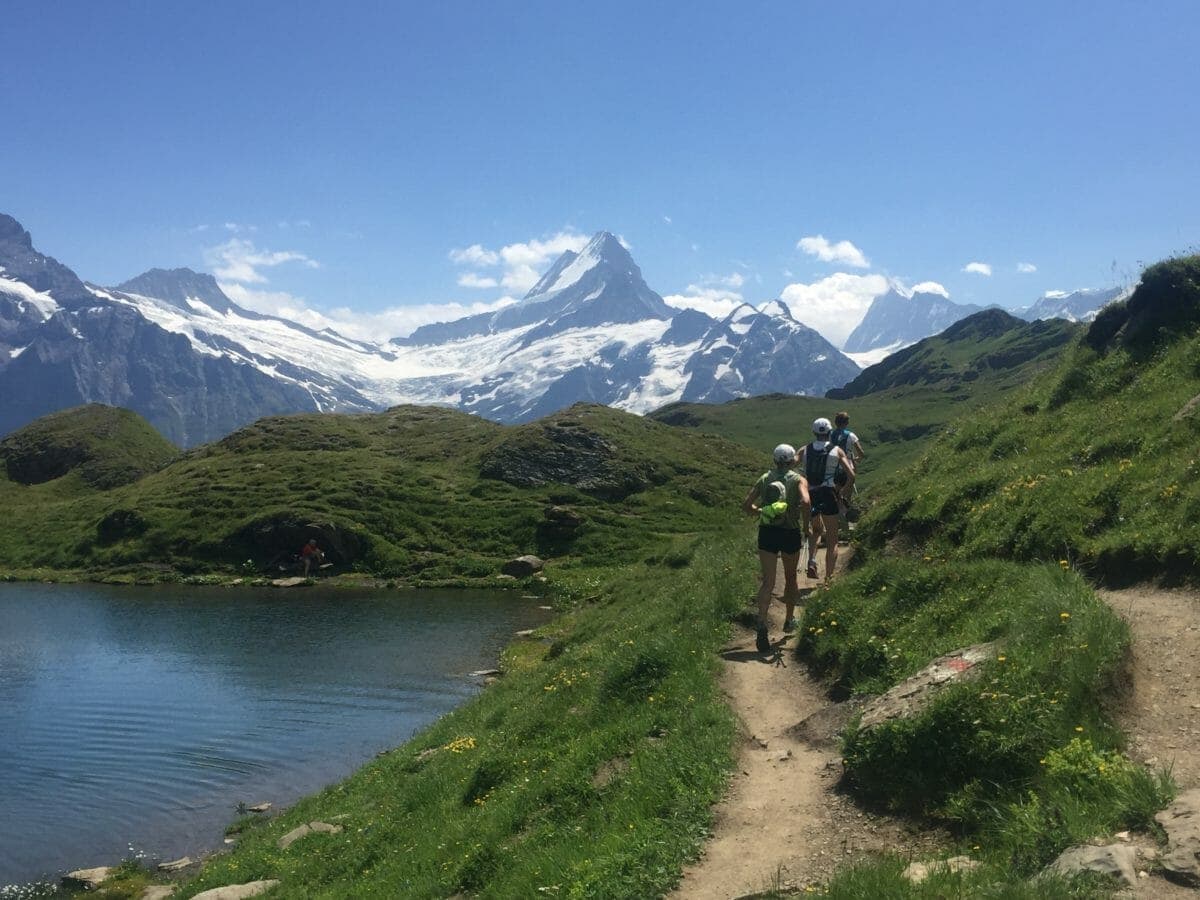Midway through my train journey to meet my Run the Alps trip guests, the Swiss meteo weather app on my phone beeped an alert for a heat wave… I was glad to be heading up into the mountains and some cooler temps. Having sought out some shade while waiting for the Swiss Postbus in the Berner Oberland town of Meiringen, guests Brian and Dorcas spotted my Run the Alps T-shirt and came over to say hi. We shared the exciting ride up to Schwarzwaldalp while the Postbus driver expertly squeezed past cars coming back down the narrow valley road. The driver didn’t hold back on sounding the loud, classic Swiss Postbus melodic horn, making the journey even more entertaining. The other three members of the group, Susan, Suesette and Suzie (and no, I’m not making that up – three versions of the same name in this group of five!) were already settled in at the inn when we arrived. They had already indulged in the local cuisine, too, having purchased local cheese bought at the roadside stand next to our inn. That night, we all got to know each other over a delicious dinner at Schwarzwaldalp Inn – and sampled the first of many local Swiss wines.Monday started with a steady climb through the meadows up to Grosse Scheidegg, for our first views of the classic North Face of the Eiger, and the Monch and Jungfrau. We enjoyed plenty of stops for photos and blueberry (known locally as heidelbeere) picking. We all agreed that the first exciting scenes from yesterday’s journey now paled in comparison to the stunning views as we climbed higher. The flow-y traverse around to the high mountain ski stop of First continued the great vistas, with the bonus of a smooth trail so we could afford to look up as we ran. Over drinks on the terrace at First, we discussed the rest of the route, including the many adventurous descent options to Grindelwald. Susan leapt at the chance to ride the ‘First Flyer’ – a long zip-line – down the start of the descent. Others went up to Lake Bachsee, a clear mountain lake where extracurricular activities included Dorcas taking a quick swim. We arrived in town a few hours later, ending the afternoon with a bit of shopping and more swimming, this time in the excellent municipal pool. The Hotel Gletschergarten provided us with a brilliant four-course meal, friendly service – and, we confess – a chance for more wine sampling.Our second day started with a beautiful ascent on the cog railway up to Schynige Platte, with views over the turquoise lakes of Thunersee and Brientzersee, on either side of the small Swiss city of Interlaken – more than a thousand meters below us. Arriving at the top, the Eiger, Monch and Jungfrau aligned beautifully for photos. In time, we set off trail running through the limestone spires of the first few kilometers from Schynige Platte.After the climb up to the Berghaus Männdlenen hut, we stopped for cakes and classic mountain fare of bread and cheese, served with gherkins. The route over the ridge presented some exposed sections and Suesette confronted her fear of heights with the kind support of the group. The two mountain goats of the group, Suzie and Dorcas, took the chance for a brief bonus excursion up the pointy peak of the Faulhorn, while the rest of the group skirted around its side. Everyone chose to take the lift down to Grindelwald to save our legs and give plenty of time for a rest before dinner. Suesette, Dorcas, Suzie and I were excited to return to the pool, though in the end we spent much of our whole time repeating the “Black Hole” – a water slide that I am convinced is the world’s scariest water slide. (As evidence: the slide starts in the dark with a few disco lights flashing…. then you are plunged into pitch darkness!)It was the night before the annual August 1st Swiss National Day. Workers put the final touches in place, including hanging flags and buntings throughout Grindelwald. There had been talk of a firework ban due to the extended bout of hot and dry weather, but serendipitously it rained for half an hour, and fireworks soon appeared against the still-visible silhouette of the Eiger.On Wednesday, August 1st, we came down to our breakfast table decorated with Swiss flags and received greetings from the staff, who were all in traditional Swiss dress. The group had been coping well with the hot weather, but nonetheless were happy to hear about a forecast that included afternoon thunderstorms. Making use again of Switzerland’s famous mountain transport, we took a quiet train up out of the valley to a small hamlet under the Eiger known as Alpiglen. Here, we split the group, with some trail runners taking the gentle, direct path up to Kleine Scheidegg. Others opted for the steeper and more exposed Eiger Trail, which runs along the base of the Eiger’s north face. At the height of land called Kleine Scheidegg, we enjoyed Chai lattes, coffees and cake while the predicted thunderstorm came and went. With clear skies back, we stretched out our legs along the smooth, flowing Panoramaweg up to the summit of nearby Mannlichen. Europe’s longest cable-car took us down to the car-free mountain village of Wengen, where traditional dancers and Alphorn players were in the swing of Swiss National Day. We didn’t have to go far to be part of the festivities: Alphorn players and their flag-thrower came right into our hotel garden. After dinner, cowbell ringers passed us as part of the lively parade in the street. And then, as if on cue, it was time for more fireworks.Thursday started with yet another expansive and delicious breakfast, with Swiss bircher muesli, fresh fruits, several types of tasty bread and a range of local meats and cheeses amongst the offerings. Then, it was time to trail run down to the steep-walled valley village of Lauterbrunnen, which seems to be Switzerland’s answer to Yosemite – only with a lot more cows! Thanks to blue skies and plenty of sun, and we enjoyed running several easy kilometers al