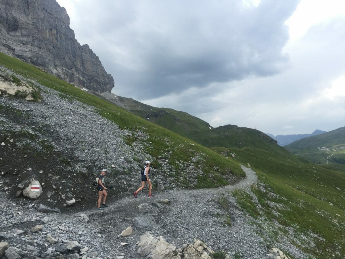 Dorcas and Suzy running the Eiger Trail before the storm arrived