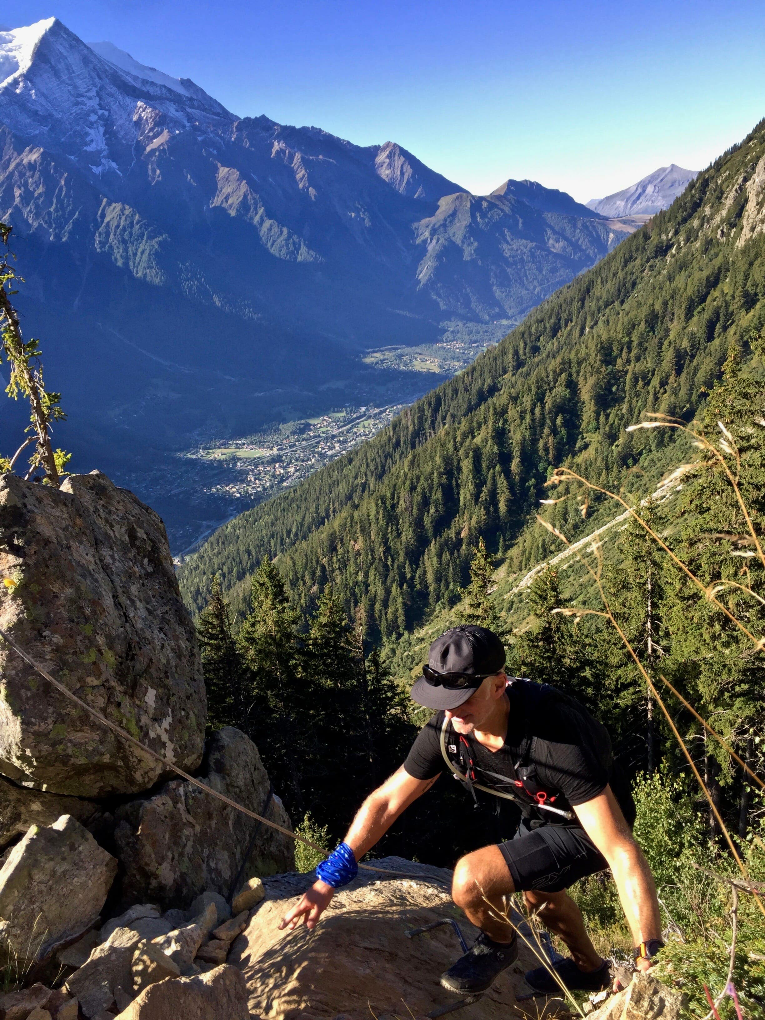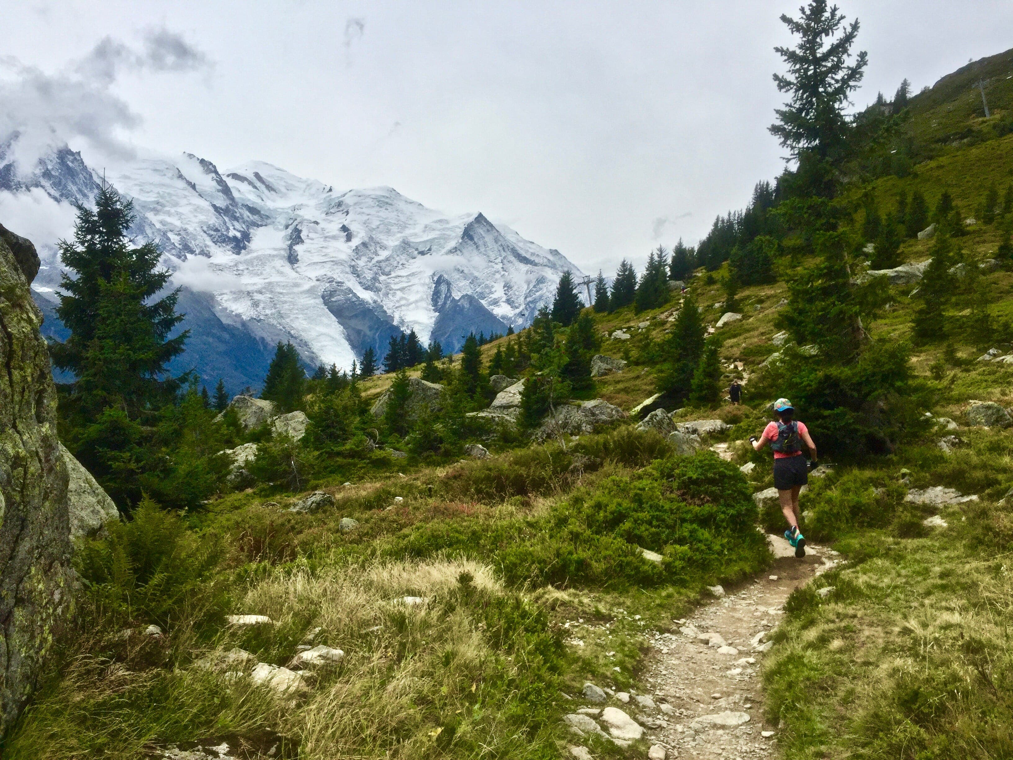 The views on this run kept changing, with the highlight being our arrival at “Le Signal,” where the Mer de Glace glacier and the mighty Dru mountain came into sight. This was when Frances revealed that Michael had been on a few race podiums in his short trail racing career, and our thoughts started to turn towards the Dents du Midi, or DDM trail race at the end of the week. Having run the course last year, I knew the main challenges would be the long, steep ascents and the rocky, technical descents. We’d certainly started to work on our uphill skills, so today we practiced our downhill techniques, thinking about body position, cadence, and field of vision.