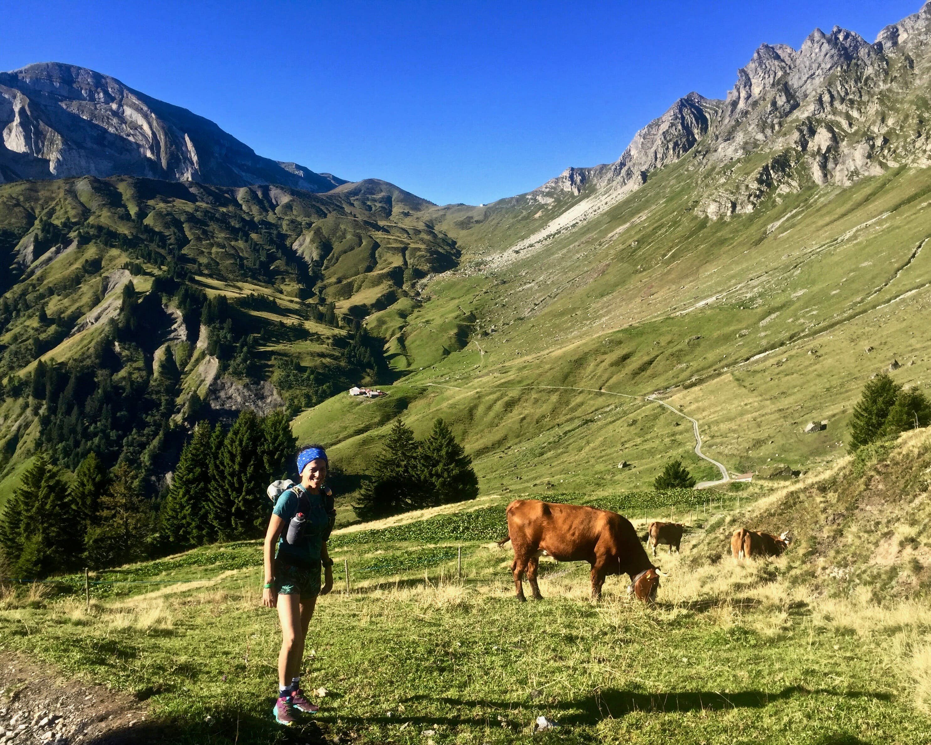 On Friday, the day before race day, Michael decided to rest. Frances was keen to get out and explore the new area, so we planned a long but mostly downhill circuit by starting with Champéry’s tram up to Croix de Culet. Straight out of the tram station, the contrast with Chamonix was clear: bright grass-covered mountains, smooth gentle trails, and lots of cows! We ran to Col de Cou on the gentle trail known as the “Route du Lait,” or milk route, named for the many cow pastures through which it flows. Arriving at the Col presented the novelty of being able to stand with one foot over the border in France, and one still in Switzerland! We continued down a beautiful crest and then Frances took advantages of mini water falls on the trail back towards Champéry to cool off. That evening, over a delicious risotto, Michael reported he had got some serious napping in while we were out. We were joined by Catriona Moxham, who had just finished Run the Alps’ Via Valais tour, and chatted logistics and tactics for the race the next day.