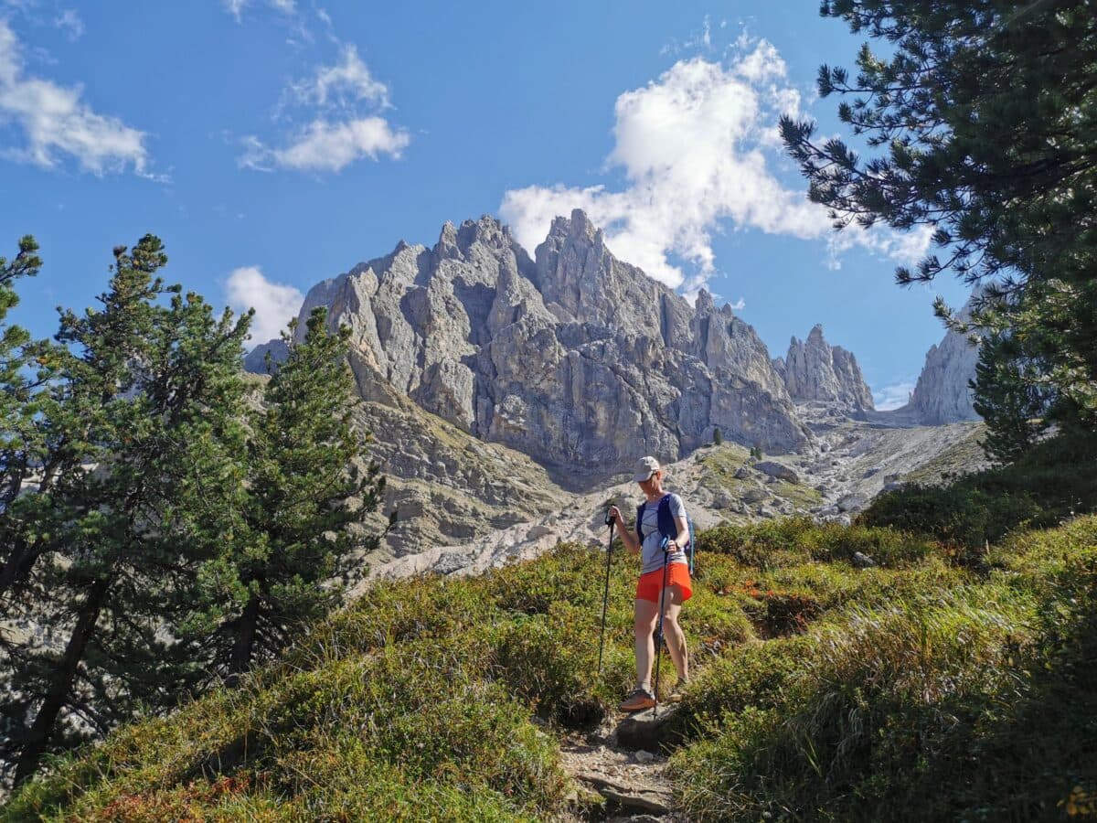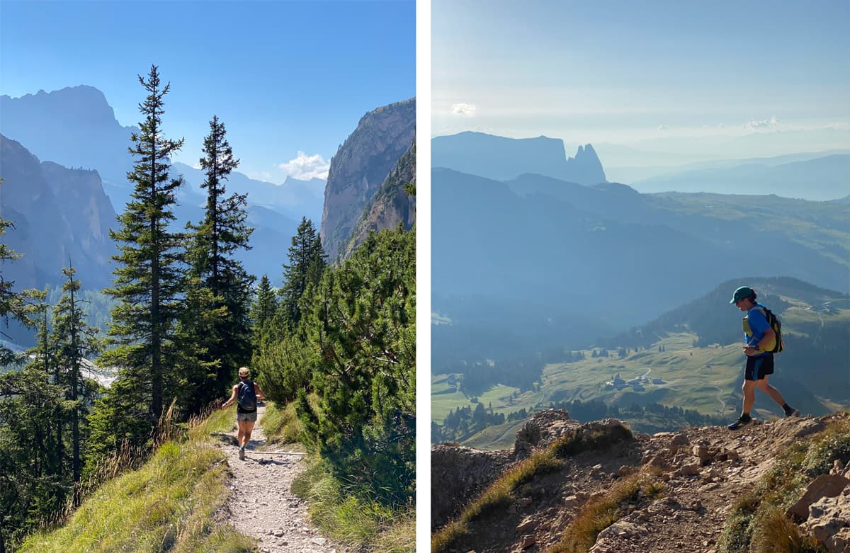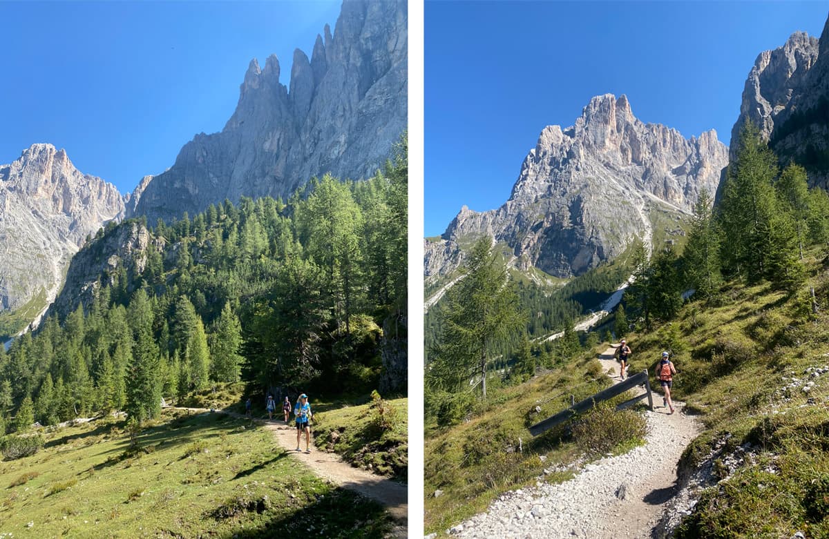 The fifth day – already a big day – saw a few extra challenges. First, the bus to our trailhead arrived late, which set us back a bit. Then on the trail, we encountered a landslide on our usual route. The trail was closed and the diversion required a good amount of extra up and down. The day wound on, and as it was getting later, these setbacks kept us running into the later afternoon. At four, we were on a vehicle track into the Val di Funes, feeling like we would never get to the hotel.