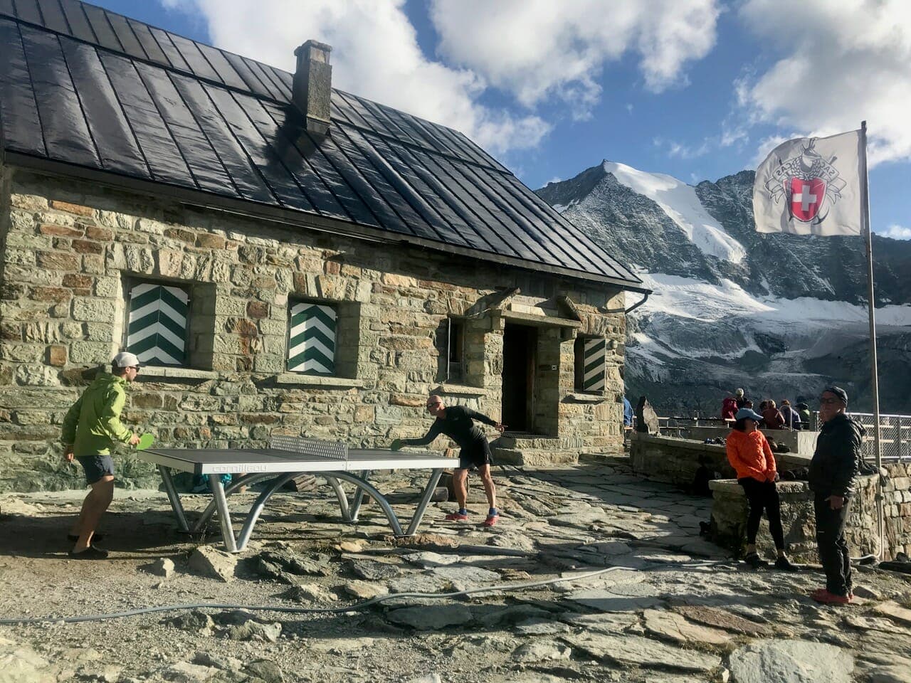 *Hanging out on the patio of Cabane Moiry, with the Dents Blanche above and the Moiry glacier below…. Then watching a match of high-altitude ping-pong. (Yes, someone airlifted a ping pong table up to the hut.)