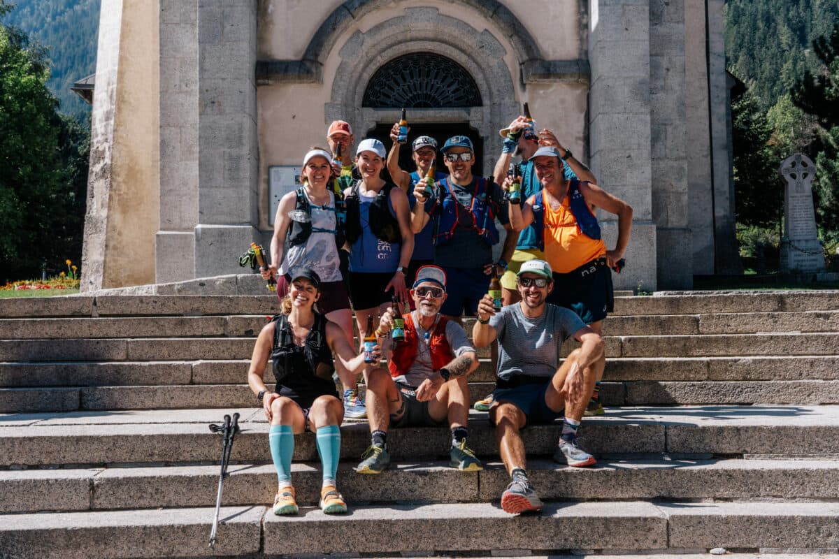 Finish photo on the steps the the church in Chamonix with Big Mountain brews. (Photo: Sam Hill)