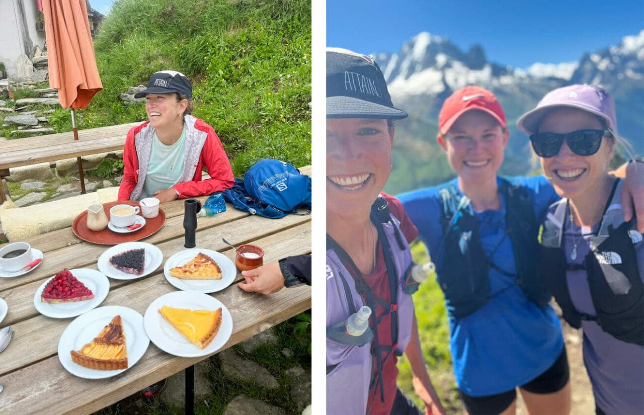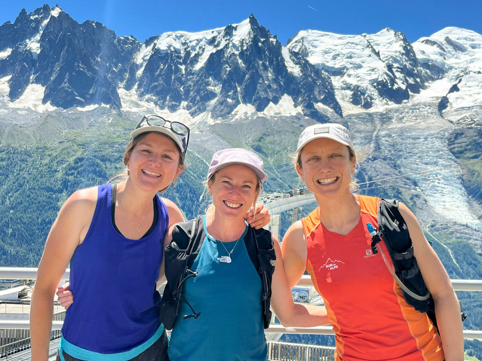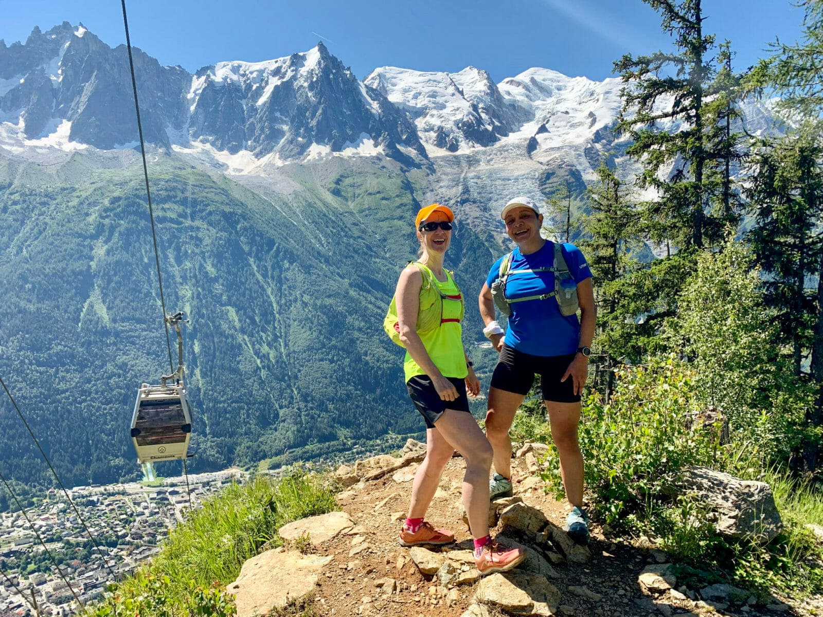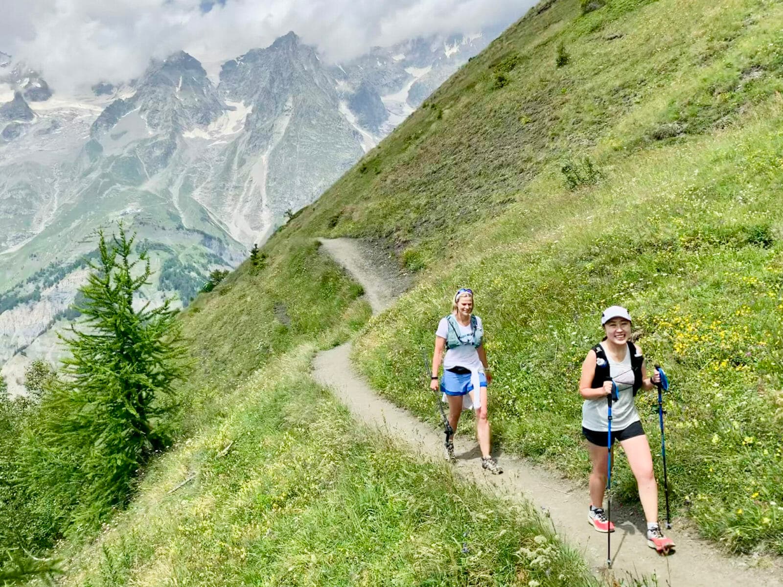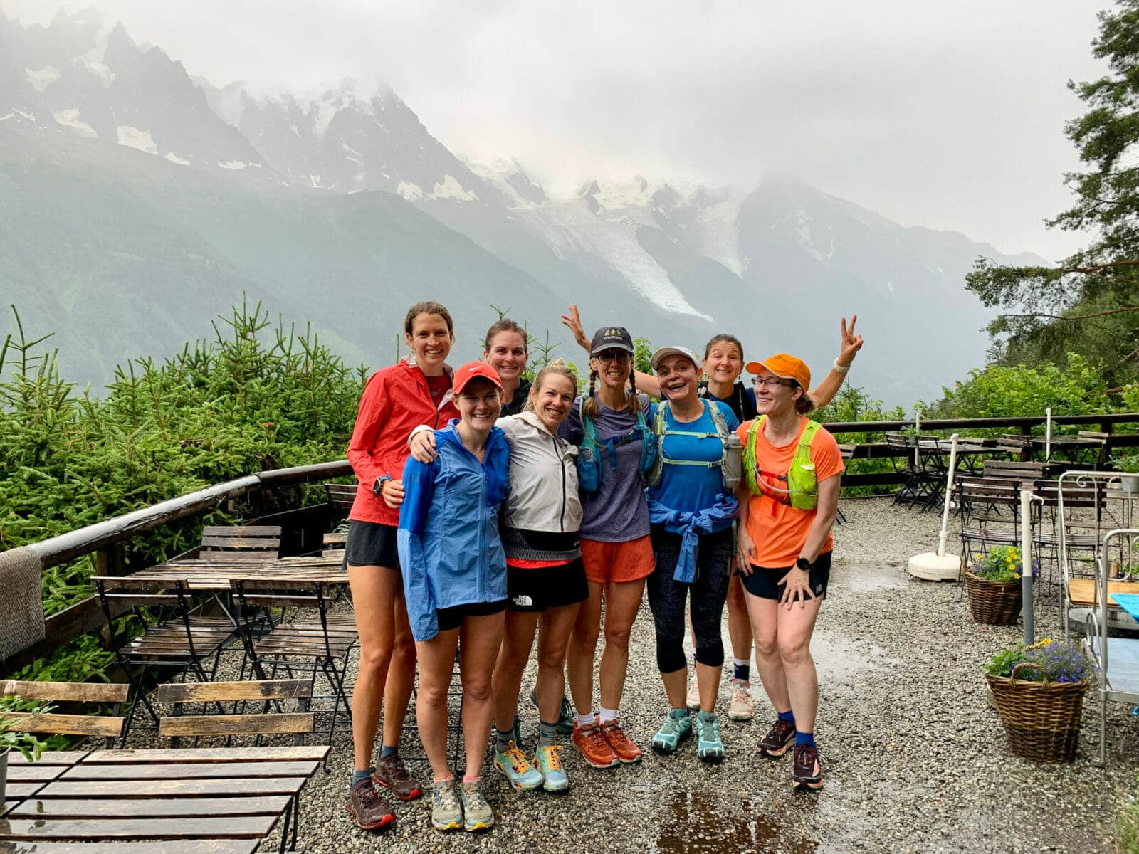 Our group of ten women from all over the globe came together to enjoy trail running in the French and Italian Alps. We spent four days running around Chamonix, taking in Café Floria, the Aiguillette des Posettes, the Grand Balcon Nord, and the Vertical Kilometer. Plus we made a journey through the Mont-Blanc tunnel to Italy to run above Val Ferret and stay overnight in Courmayeur. We also did a lot of chatting, laughing, eating, and even an afternoon at QC Terme, a great new spa in Chamonix. The weather was varied, but mostly sunny, and after the first day we avoided the rain. We were delighted to meet special guests on three different evenings: North Face athletes Fernanda Maciel and Stephanie Case, and Tor des Géants Head of Communications Erica Motta!