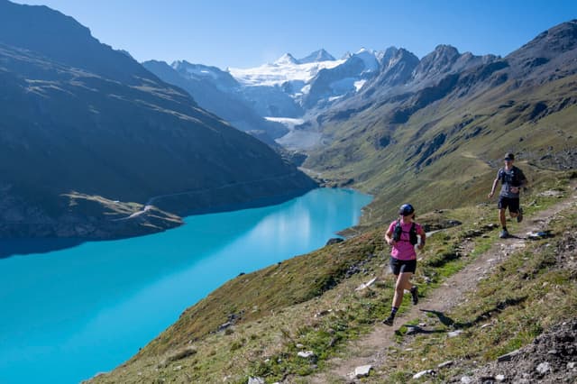 Today we’ll climb up and over Sorebois pass to be greeted by views of azure Lake Moiry. We’ll run above the lake to the Moiry glacier, and then the Cabane de Moiry for some refueling with classic Swiss hut cuisine. A mix of downhill and flat running alongside the lake brings us to the traditional Swiss village of Grimentz.