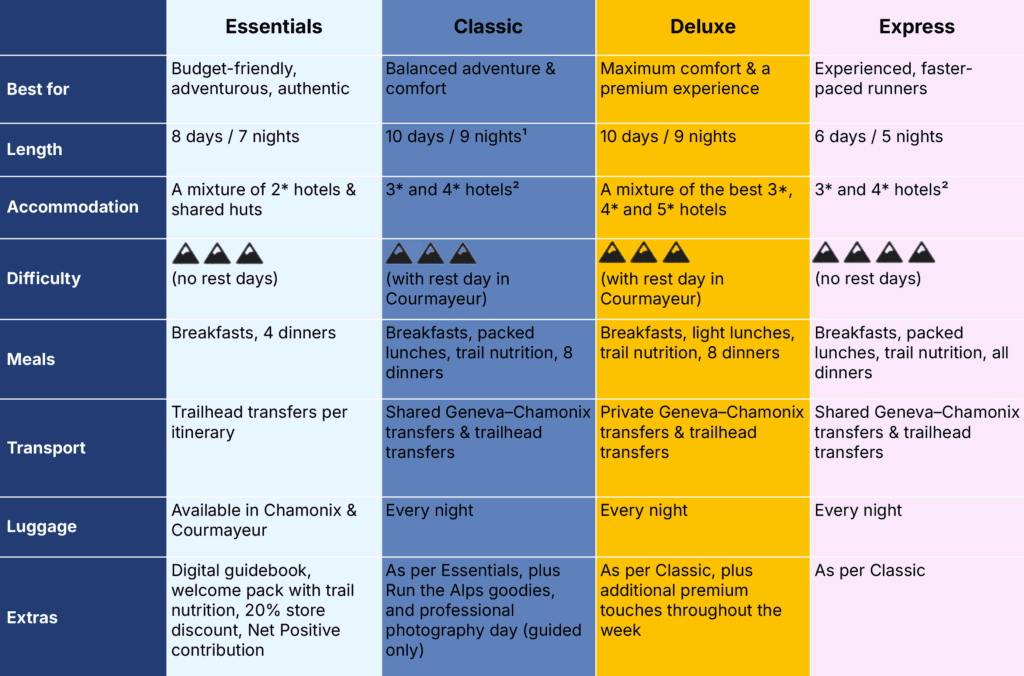 Whether you want an authentic hut-to-hut adventure, a balanced mix of comfort and challenge, or a premium experience with every detail handled, Run the Alps offers a TMB trip that’s right for you.