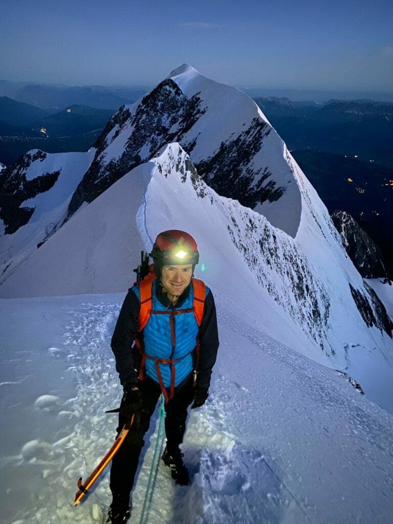 Mike: Climbing the Ridge to the Italian Point. We had a full moon on the approach. Sunrise was remarkable, seeing the orange glow and thinking about my friends and family down below and thinking that they were just waking up. Being super high on the massif and seeing the world come to life while still being hyper-focused on traversing this ridge, that was definitely a high point, both physically and emotionally. Plus, it’s just so beautiful.