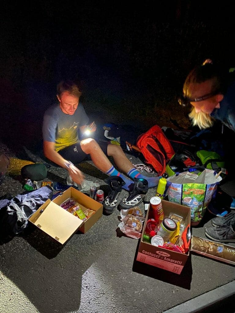 Aid station: Mike sorts food and gear during a stop in Praz de Fort, Switzerland, with help from his wife and crew chief, Steph Lefferts. (Photo: Doug Mayer.)