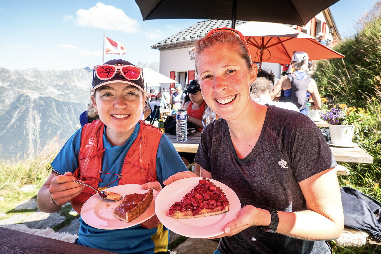 When we got to Refuge Plan de l’Aiguille, the red window and door shutters and Haute Savoie flag flying in the front created a bright and welcoming atmosphere. We all came together and got two picnic tables out front overlooking the valley. In what I’ve learned to be classic Alps trail running fashion, we stopped and got food from the refuge. Some got a slice of one of the famous tarts, while others went savory with an omelet. A few, including myself and Mimmi, got both. They were out of blueberry tarts for the day so I got a raspberry one – sweet and refreshing.