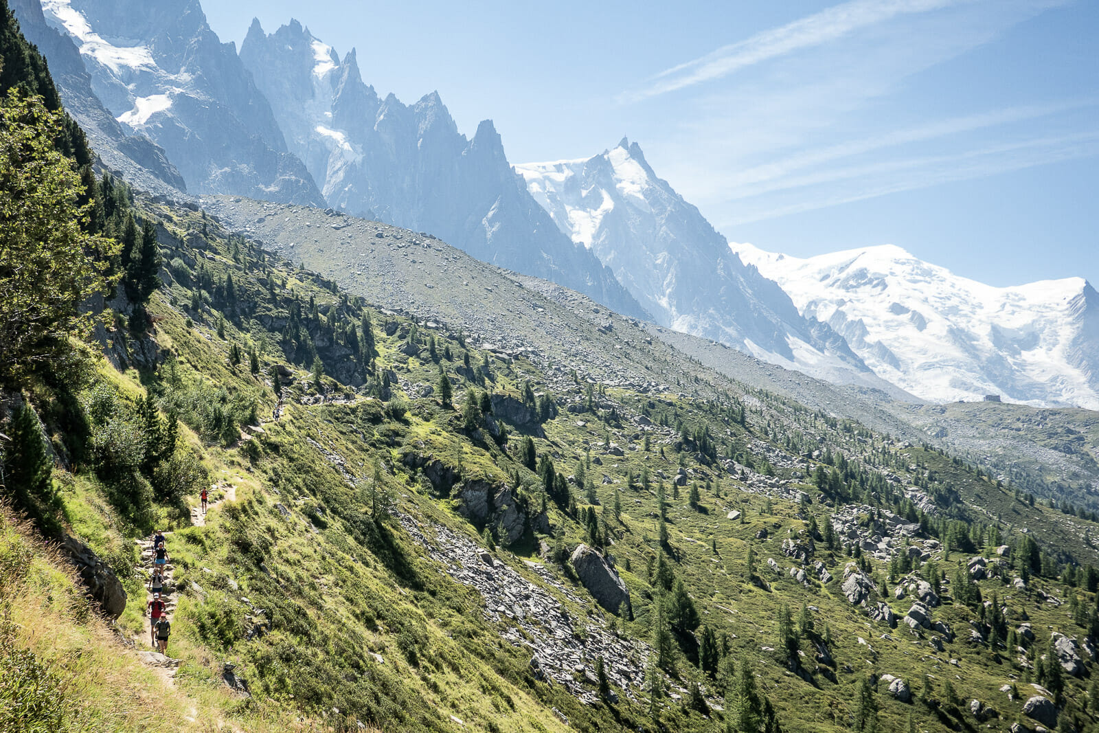 There wasn’t any pressure to go at a certain speed. The trail felt technical enough that I couldn’t run all of it — I fast hiked parts. During the times I did pick up speed, I felt like a kid on an obstacle course dancing from one rock to the next. Deciding each foot placement and rock jump felt like a mental game almost as much as a physical challenge. All the while, being able to slow down and look below at Chamonix, across to Brévent, an 8,284-foot-high alpine summit on the opposite side of the valley, and ahead at Mont Blanc.
