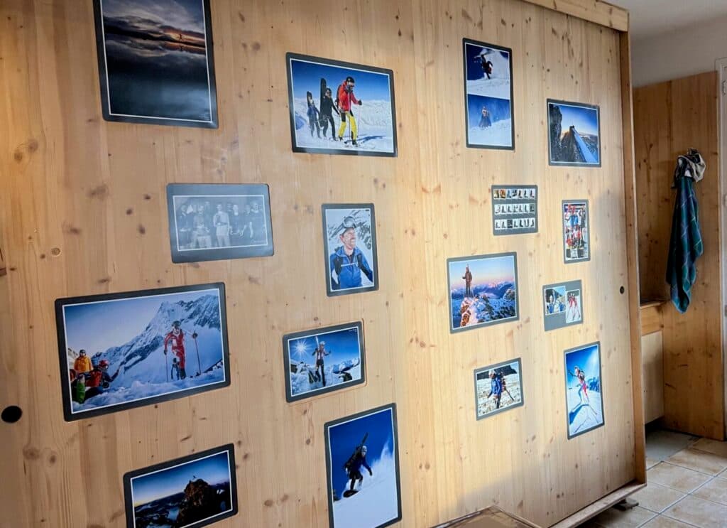 Spanning one wall, there’s a watercolor of the Belledonne mountain range, where, two years ago, he skied and climbed over 21 summits in one push. That’s 10,300 meters of climbing. “Now I’m too old!” he protests. But he’s also clearly still in great shape.