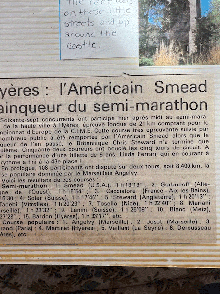And, I went to France’s Blue Coast, La Côte Bleue in French. [Editor’s note: This is Provence’s coast on the Mediterranean Sea.] They had a race down there, and there was a guy racing named Chris Stewart. He was fast! He could run a 5km on the track in around 13 minutes. We raced, but I killed him because it was hot and hilly. Nobody could beat me on the hills.