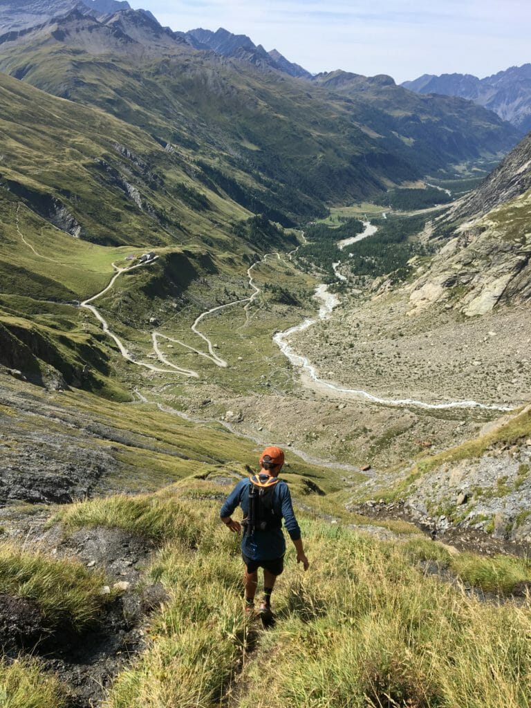 Another fantastic run is part of the Tour du Mont-Blanc from Col de la Seigne to Courmayeur. Again, utilize the local bus system – this time going in the opposite direction from the run described above. It’s a two euro bus trip up Val Veny to Lac Combal. Run via Rifugio Elisabetta to the Col de la Seigne for some beautiful bonus kilometers, then run back along the “TMB,” being sure to stop and feast at Rifugio La Maison Vieille di Giacomo. Ask for the “Topher” special– named for longtime UTMB friend Topher Gaylord. It’s the best meal I’ve ever had mid-run! Then, work off your meal by descending the steep single track back to Courmayeur.