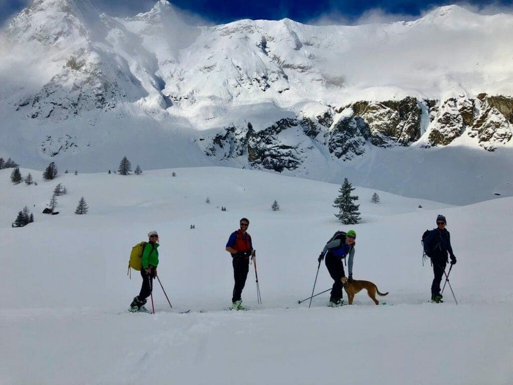 Oh! And here’s Run the Alps’ friend and guide-in-training Mara Larson, Alister, Emily, four-legged adventurer Betty, and Run the Alps Race Finder Manager Kate Wood out this past weekend, skiing high above Le Buet, France, en route to some afternoon tea at Refuges de Loriaz.