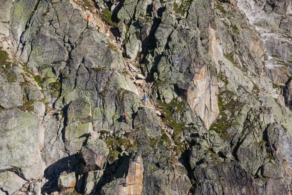 The course has three distinct sections. It begins in the middle of Courmayeur, on the cobblestoned Viale Monte Bianco. From there, runners head out of town along medieval-era roads, past centuries-old stone buildings, finishing the village section by running alongside the Fiume Dora Bàltea, the river that divides Courmayeur and Dolonne. From there the route follows an old hunter’s path, switchbacking across the slope, then foregoing the gentler angle and aiming straight uphill. One thousand vertical meters after its start, runners get a reprieve at Pavillon, where race organizers offer a full aid station and a chance to drop your poles for later pickup. Here is where the excitement begins, as well-organized volunteers locate and pass you your helmet as you run past.