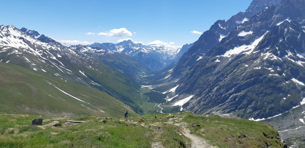 Looking back from where we came, from Grand Col Ferret, on the border between Italy and Switzerland. Not a bad view! (Photo: Alister Bignell.)