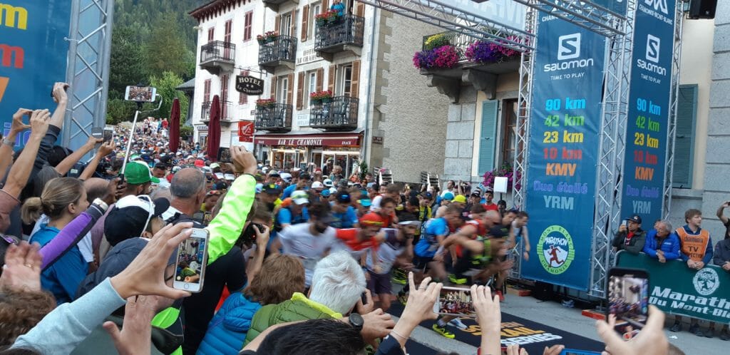 Race time! The Marathon du Mont-Blanc leaves Chamonix and heads for the mountains. (Photo: Alister Bignell.)