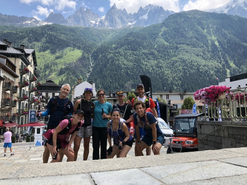 The ceremonial finish line for the Tour du Mont Blanc, our crew enjoyed a few beers on the steps of the St. Michel church in Chamonix. (Photo: Doug Mayer.)