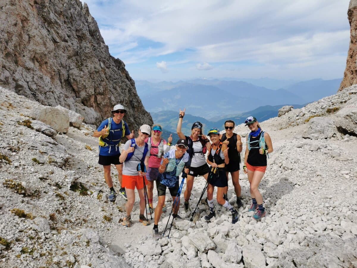This September’s Run the Alps tour in the Dolomites was led by Cam Bevan and Astrid Renet, and our group consisted of eight experienced guests. The tour began in the Val Gardena, a beautiful valley in the western Dolomites with many wonderful opportunities for trail running. Our team was based in the villages of Selva and Ortisei for two nights each, as well as the delightful mountain hotel Plattkofelhütte/Rifugio Sasso Piatto. Our final two nights were spent in Hotel Kabis in the Val di Funes. The weather was excellent, with blue skies on five out of six days, and a bit of rain kept things fresh on the final day.