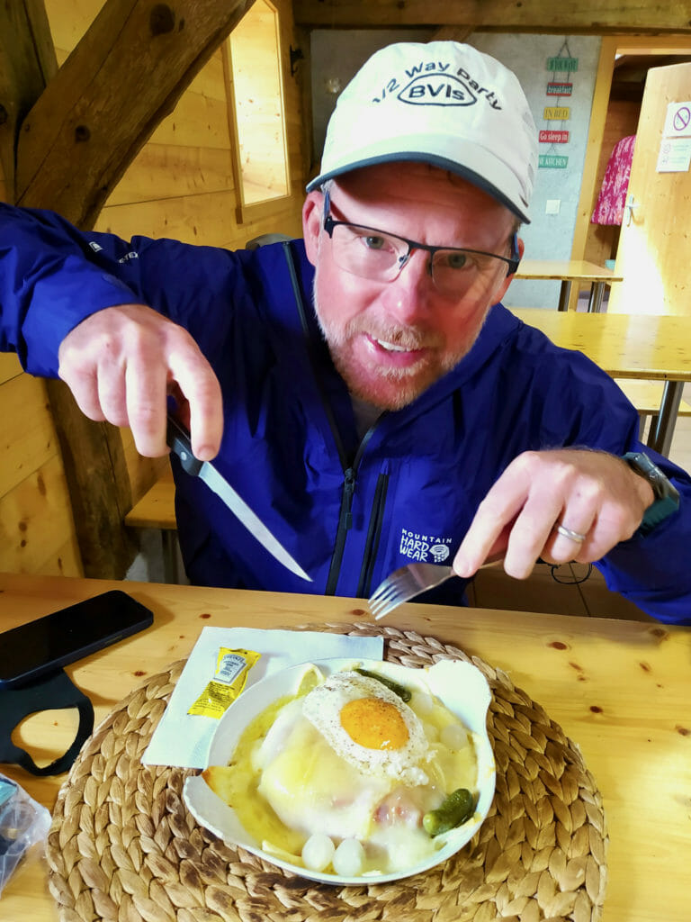 Time to add back some calories! John samples some local cuisine– a Croute au Fromage– along the route. (Photo: Gary Daines.)