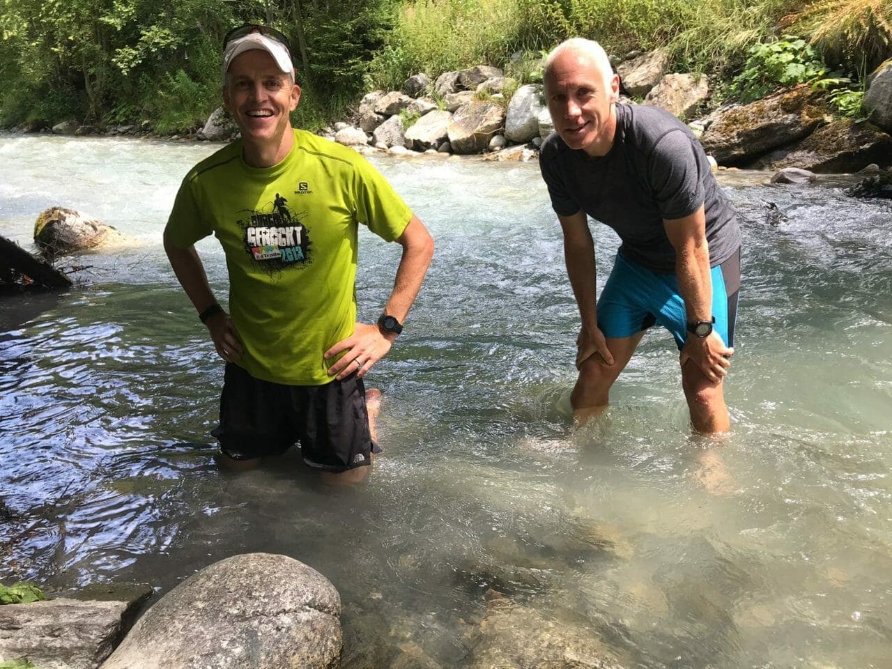 In the end, we called it a tie, which proved fortuitous, as beers were provided by Doug and Ray, who met us at the fabulous Gai Soleil hotel in Les Contamines, where we all sat in the ancient water trough for a much needed recovery soak, sipping special Run the Alps beers from Chamonix’s Big Mountain Brewery, founded by the husband of Run the Alps guide Emily Geldard. It was the perfect end to a near-perfect day!