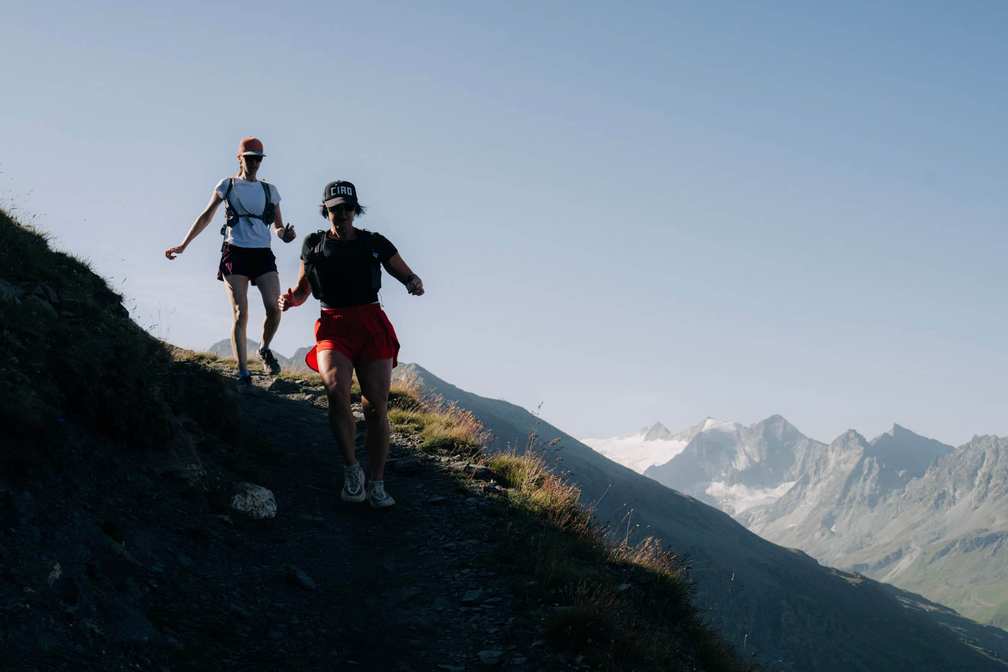 The Classic Haute Route is usually hiked in 10 days, but you’ll run it in 7 days, covering around 30km per day. The trails are varied, adventurous, and more technical than those on the Tour du Mont Blanc. The Classic Haute Route is one of the most challenging trips offered by Run the Alps, and you should be comfortable on technical and remote terrain. Flowy single track balcony trails lead to steep, rocky climbs, bringing you close to the high mountains.