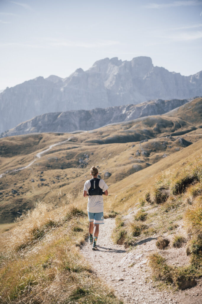 The trails here tend towards smooth and scenic, with many high traverses, such as around the rim of the aptly named Vallunga, or “long valley” which is 6 kilometers long with 1,500-foot high cliffs on both sides.